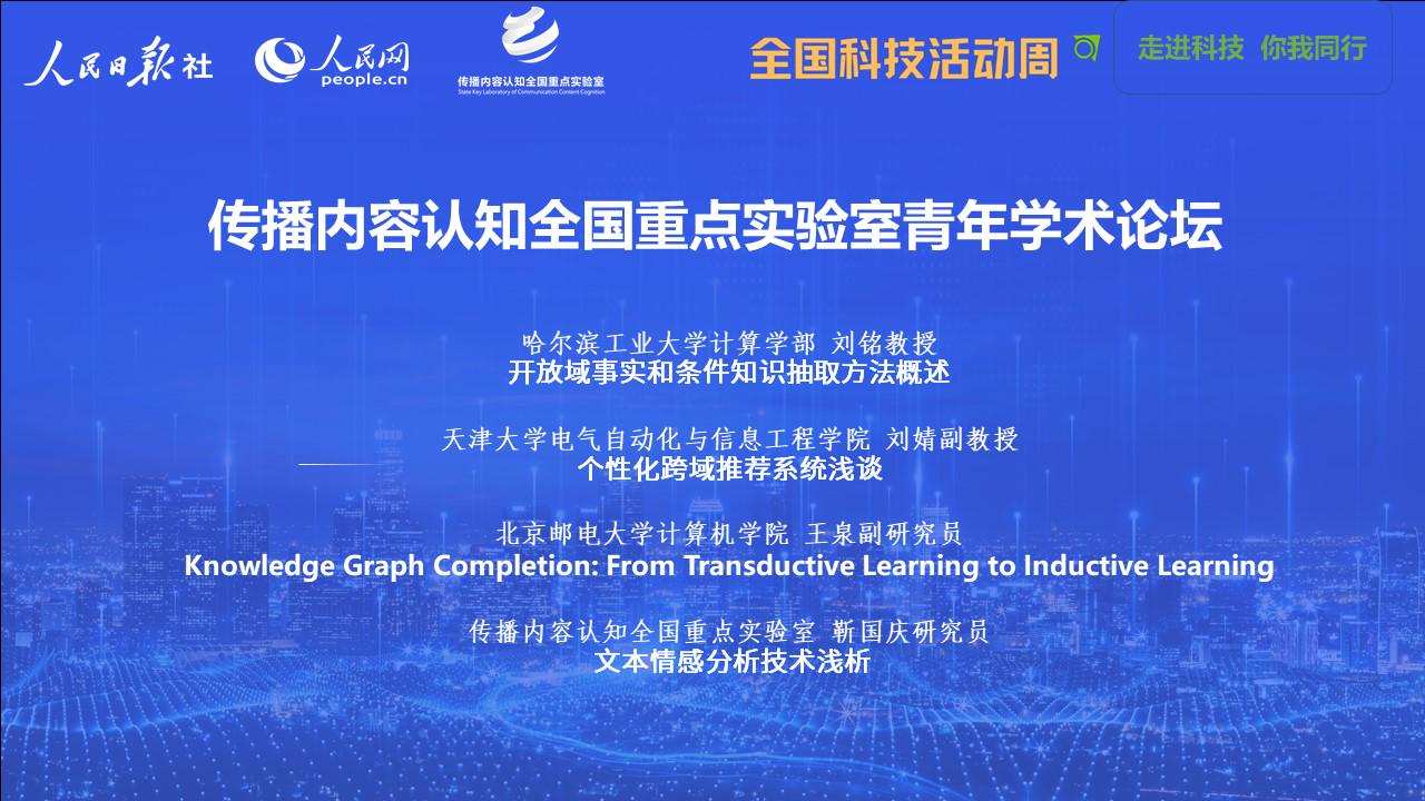 本次論壇由實驗室首席科學家張勇東教授主持,邀請了哈爾濱工業大學計算學部劉銘教授、天津大學電氣自動化與信息工程學院劉婧副教授、北京郵電大學計算機學院王泉副研究員、傳播內容認知全國重點實驗室靳國慶研究員這四位青年研究學者分別圍繞知識圖譜技術、個性化推薦技術、文本情感分析技術等內容,做了《開放域事實和條件知識抽取方法概述》《個性化跨域推薦系統淺談》《Knowledge Graph Completion: From Transductive Learning to Inductive Learning》《文本情感分析技術淺析》這四個專題報告,展現了知識圖譜、個性化推薦、情感分析等這些關鍵核心技術在相關領域的最新進展和研究成果,并對未來發展趨勢做出深刻思考。